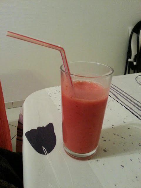 Quando os descongelámos, os morangos estavam completamente moles e nao dava mesmo para comê-los. Que pena! Solução: fazer um delicioso smoothie! Perfeito para um lanche, pequeno-almoço ou até sobremesa fresca e ligeira.
